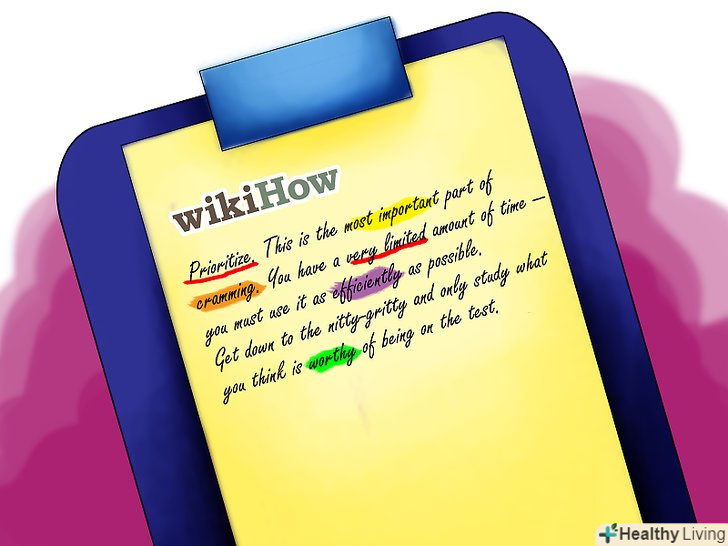 Розставляйте пріоритети.це найважливіша справа в зубрінні. У вас дуже мало часу, і ви повинні використовувати його максимально ефективно. Направте свої сили на найголовніше і вчіть тільки те, що найімовірніше буде на іспиті.- Зосередьтеся на найважливіших правилах і запам'ятовуйте головні формули. Пропускайте деталі і повертайтеся до них тільки якщо у вас залишається час.