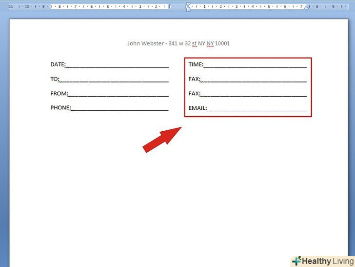 Вкажіть час, номери факсів і свою адресу електронної пошти в правій колонці.кожну частину інформації відокремлюйте великою літерою і двокрапкою після.- Вкажіть час (»Час«), номер факсу одержувача — » ФАКС«, номер факсу — » ФАКС«, адресу електронної пошти — »EMAIL".