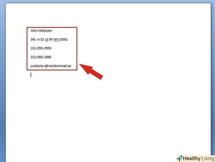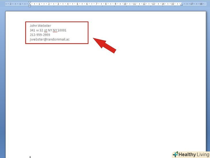 У верхньому лівому куті вкажіть свою контактну інформацію. кожен з цих пунктів слід розміщувати на окремому рядку. Не забудьте вказати своє повне ім'я, адресу, номер телефону та адресу електронної пошти. Це допоможе потенційним роботодавцям зв'язатися з вами.[2]- Якщо у вас є факс, потрібно вказати його під номером телефону і над адресою електронної пошти.
