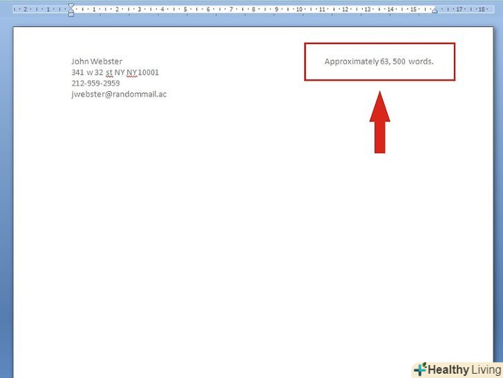 Вкажіть кількість слів.приблизну кількість слів слід розмістити у верхньому правому куті. Якщо ви пишете роботу, при оцінці якої буде строго враховуватися обсяг (кількість слів), переконайтеся, що ви дотримуєтеся головних принципів, інакше ваша робота буде автоматично дискваліфікована.[13]- Необов'язково вказувати точну кількість слів. Наприклад, якщо Ваш рукопис становить 63 472 слова, округліть його до 63 000 або 63 500.