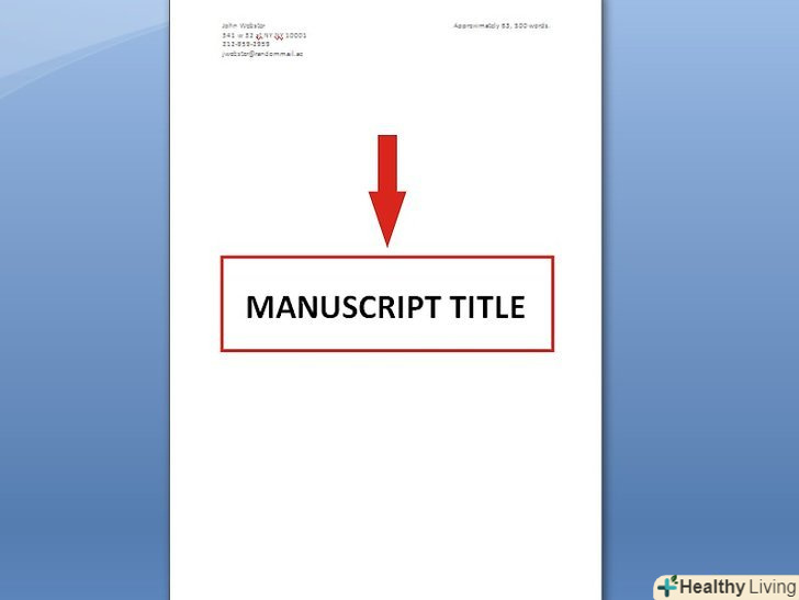 Напишіть заголовок рукопису. У центрі сторінки введіть повну назву рукопису. Майте на увазі, що заголовок не повинен бути довшим одного рядка.[14]- Написання назви великими літерами-досить поширена практика, але це необов'язково.