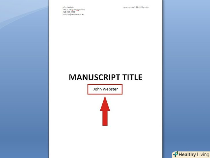 Вкажіть свою контактну інформацію.введіть своє ПІБ, адресу, номер телефону та адресу електронної пошти у верхньому лівому куті титульної сторінки. Хоча ви можете включити заголовок свого рукопису на титульний аркуш, це окремий документ від титульного аркуша.[12]- Використовуйте своє справжнє ім'я. Якщо ви відправляєте рукопис під псевдонімом, можна вказати своє справжнє ім'я під ним. Можна написати псевдонім в такому форматі:» А.К. А «(Also Known As — » також відомий під ім'ям...") або такому: (псевдонім: Джон Доу).
