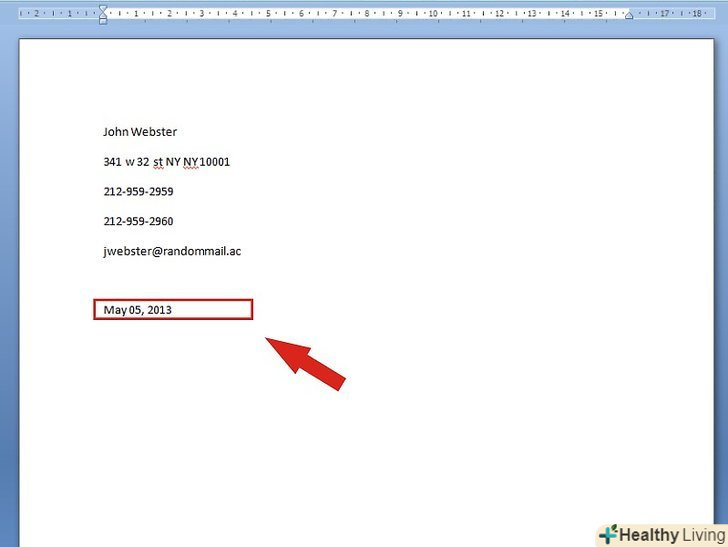 Напишіть сьогоднішню дату під своєю контактною інформацією.дату потрібно писати у форматі»день, місяць, рік". Якщо ви перебуваєте за кордоном, наприклад, в США, слід використовувати формат " місяць, день, рік», а в Китаї і Японії — «Рік, місяць, день».[3]- На території РФ прийнято два формати написання дат: числовий і словесно-числовий.[4] напишіть повну назву місяця або скоротіть, написавши тільки його номер. Наприклад, можна написати: "01.01.2001", а можна " 1 січня 2001 р.».