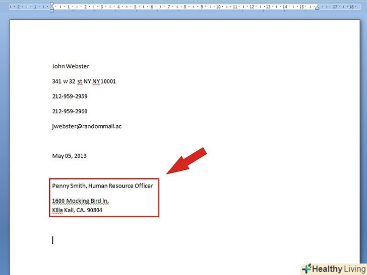 Вкажіть ім'я та адресу одержувача.вкажіть конкретну контактну особу, якій ви відправляєте своє резюме (а також при необхідності його наукове звання або ступінь) і адресу організації. Ім'я та звернення одержувача слід вказувати в одному рядку і розділяти Коми. Назву компанії вкажіть під ім'ям Вашої контактної особи, а адресу компанії розмістіть нижче.[5]- Зверніть увагу, що вам не потрібно вказувати адресу електронної пошти, номер телефону або факс компанії.