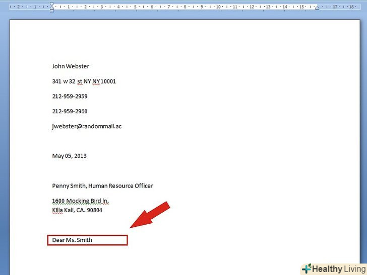 Зверніться до одержувача по імені-по батькові.в офіційному листі краще використовувати звернення»шановний". По можливості краще адресувати свій лист конкретній людині. Але коли ви не знаєте його ім'я, ви можете надіслати лист "шановному менеджеру з кадрів», «шановному спеціалісту з кадрового відділення»або "шановному відбірковому комітету".[6]- Навіть якщо ви дізнаєтеся стать Одержувача, не варто використовувати звернення «пан», «громадянин» і так далі. Просто напишіть:» Шановний Валентин Дмитрович «або»шановна Людмила Костянтинівна".