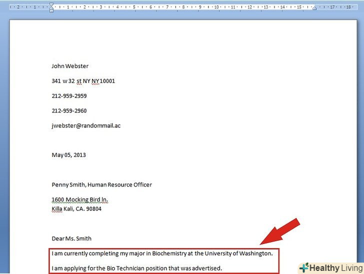 Напишіть вступ.вступ має бути коротким і містити основну і важливу інформацію. Якщо у вас до цього ви контактували з цією організацією або її представником, повідомте про це у своєму вступі.[7]- Якщо ви студент, вкажіть університет, в якому ви навчаєтеся, і свою спеціальність.