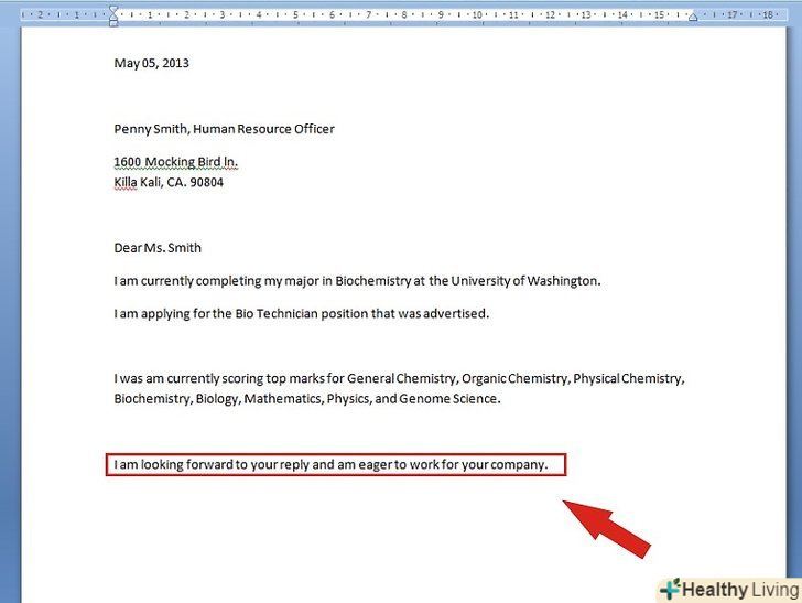 Коротко завершіть лист.напишіть короткий заключний абзац, в якому висловіть своє прагнення до роботи на цій посаді. На цьому етапі ви також можете запросити інтерв'ю або повідомити, що маєте намір зв'язатися з читачем через кілька тижнів.[9]- Ви також можете вказати свій номер телефону та адресу електронної пошти, але це необов'язково, оскільки ця інформація включена в заголовок.