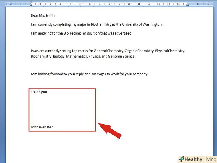Завершіть лист формально.ввічливим закінченням листа може стати фраза» спасибі «або» з повагою", потім додайте своє ПІБ на чотири рядки нижче висновку. У проміжку між висновком і ПІБ поставте свій підпис.[10]- Офіційні документи краще підписувати чорною ручкою.