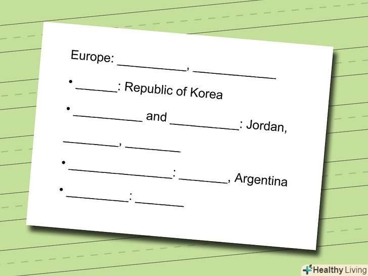 В яких випадках ефективно заучування по частинах.заучування по частинах допомагає в тих випадках, коли необхідно запам'ятати предмети або поняття, що складаються з більш дрібних частин в певному порядку. У нашому прикладі можна розділити країни по континентах; елементи періодичної таблиці можна розділити за типами; а якщо вам потрібно завчити, з чого складається двигун автомобіля, можна розділити його на підсистеми (подача палива, двигун, Вихлопна система і Електрика).- Якщо ви коли-небудь намагалися запам'ятати номер телефону, можливо, ви звернули увагу на те, як ми їх записуємо – цифри комбінуються таким чином, щоб номер було простіше запам'ятати по частинах. Наприклад, телефонний номер Білого дому (202) 456-1111 легше запам'ятати як послідовність з трьох цифр – 202, 456 і 1111 – ніж як одну складну цифру– 2 024 561 111.