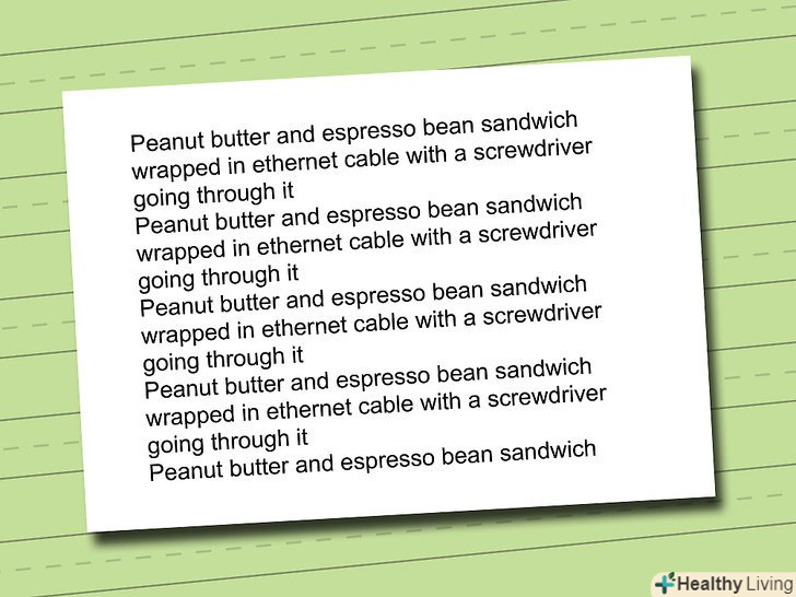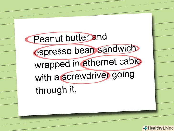 Складіть речення або зоровий образ, що складаються з усіх тих предметів або понять, які вам потрібно запам'ятати.це найвеселіша частина даного методу: чим більш безглуздим або маячним буде ваша пропозиція або образ, тим легше вам буде його запам'ятати. Наприклад,- горіхове масло і сендвіч з кавових зерен обгорнуті інтернет-кабелем і закріплені викруткою.