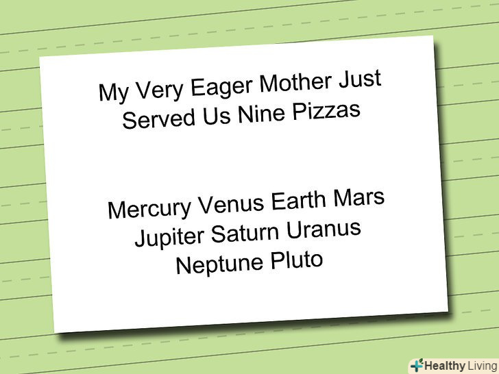 Створіть мнемонічну схему.мнемонічна схема-це просто" ключове " речення або фраза, що допомагають запам'ятати необхідні предмети або поняття. Наприклад, можна вигадати просте і нічого не значуще слово.