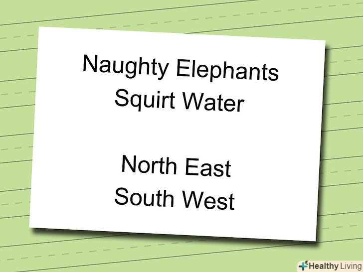 Вивчіть метод мнемоніки.Мнемоніка - це просто кумедне слово, з яким ви, можливо, знайомі ще з молодших класів. Якщо ви коли-небудь використовували «кожен мисливець бажає знати ... " для запам'ятовування кольорів веселки (червоний, помаранчевий, жовтий, зелений і так далі), значить, ви користувалися методом мнемоніки.