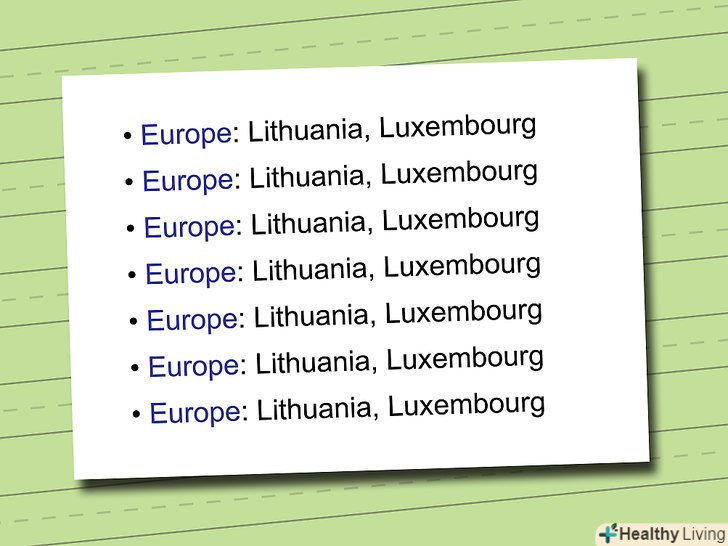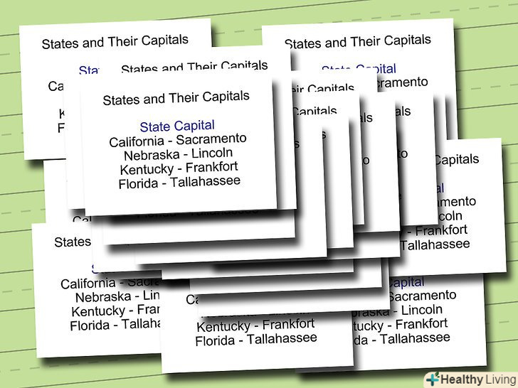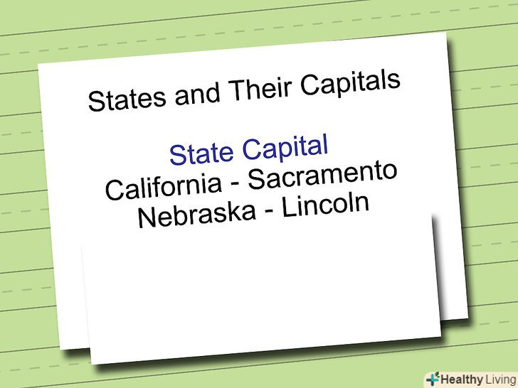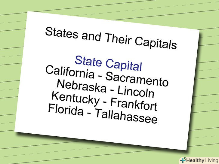Тренуйтеся відтворювати прочитане, не підглядаючи в запису. спробуйте закрити список аркушем паперу і перерахувати все, що в нього входить. Спробуйте перерахування по частинах або цілком-чи вийде у вас згадати останні кілька пунктів?- Спочатку у вас може бути багато помилок-не турбуйтеся з цього приводу! Ваш мозок ще тільки звикає до такого типу роботи. Продовжуйте тренуватися, і через кілька хвилин ви зможете запам'ятати все, що вивчили.