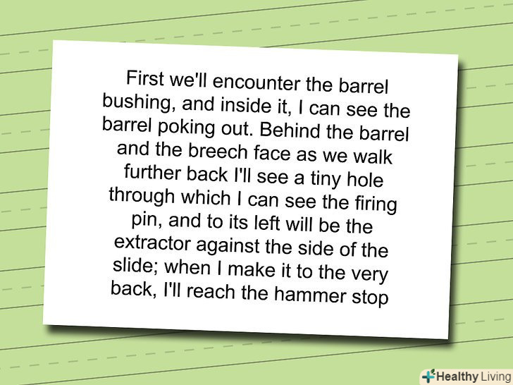 Порепетируйте прогулянку по своїй ментальній карті і звернення до всіх тих предметів і понять, які вас потрібно запам'ятати.це може бути настільки захоплююче і цікаво або ж настільки просто для запам'ятовування, наскільки ви самі того захочете. Наприклад, в нашому випадку крихітний чоловічок може пройти крізь затвор зі словами:- " спочатку нам на шляху зустрічається напрямна втулка, а всередині неї ми бачимо визирає втулку. Позаду втулки визирає патронник, а пройшовши трохи далі я бачу крихітне отвір, крізь яке можна побачити бойок. Зліва ж від нього з краю від затвора буде витягувач гільз; а пройшовши в саму глиб, я доберуся до куркового упору".