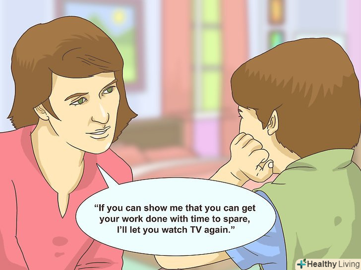 - Чітко поясніть, що ваші покарання-це спосіб мотивувати його краще вчитися. Наприклад, можна сказати: «телевізор забирає у тебе занадто багато часу, так що його не вистачає на виконання домашньої роботи. Якщо ти зможеш продемонструвати мені, що ти в змозі виконати всю свою домашню роботу і при цьому у тебе залишиться вільний час, я знову дозволю тобі дивитися телевізор».