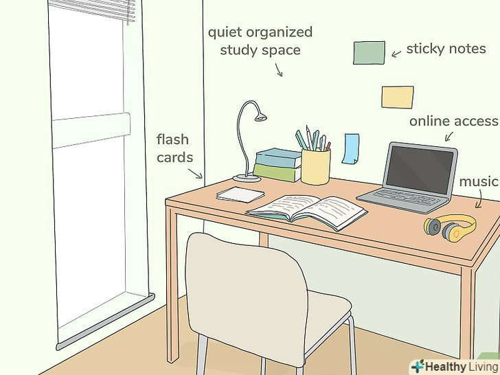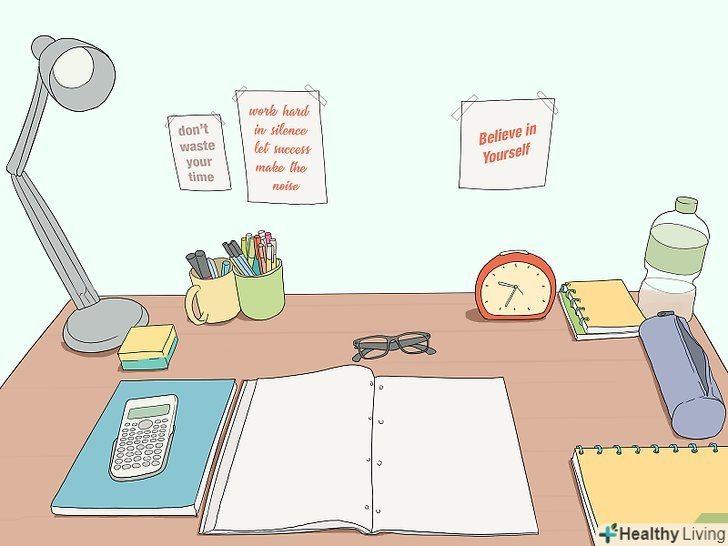 Приведіть в порядок робоче місце і розкладіть навчальні матеріали.Ваш стіл в спальні або столик в кафе потрібно привести в порядок і прибрати зайве.[15] при необхідності відкладіть речі в сторону, щоб розібратися з ними пізніше. На вільному столі розкладіть підручники, конспекти, зошити, ручки, маркери, Папір для нотаток та інші необхідні матеріали. [16]- При виборі робочого місця намагайтеся позбутися від будь-яких відволікаючих чинників. Сідайте спиною до холодильника або вікна, якщо вони заважають вам зосередитися. Працюйте за різними столами з подругою, якщо Ви відволікаєте один одного.