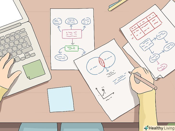 Використовуйте наочні засоби, щоб знаходити зв'язки і запам'ятовувати ідеї. якщо вам підходить візуальний стиль навчання, спробуйте створити діаграму зв'язків або діаграму Венна для організації навчальних тем. Використовуйте різні кольори, стрілки, знаки і символи, щоб наочно зобразити поняття і концепти з підручників. Використовуйте колірні виділення в конспекті, щоб пов'язувати ідеї і теми.[22]- Замість документа PDF або підручника повторюйте нові слова іноземної мови за конспектом, написаним від руки кольоровими ручками, щоб вам було простіше запам'ятати інформацію.