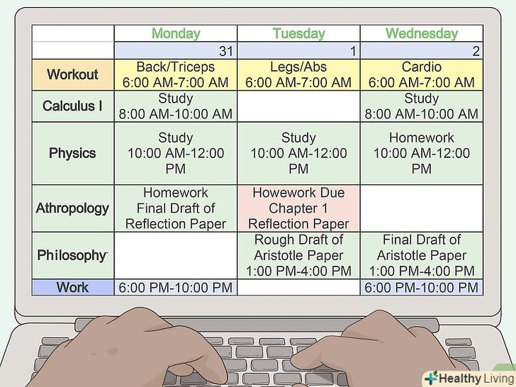 Визначайте крайній термін або вікно в розкладі для кожного завдання.розділіть всі завдання на здійсненні цілі і спробуйте інтегрувати в свій розклад. Якщо вам комфортно працювати в жорстких умовах, то визначте час початку і завершення роботи над кожним завданням. Для гнучкості можна визначити крайній термін виконання кожного завдання і вибирати за масштабністю або рівнем складності.[11] у будь-якому випадку кожен день плануйте час для занять.- Думки на кшталт:» на цьому тижні потрібно що-небудь вивчити«, — сприяють зволікання, але думки:» буду займатися з 18:00 до 21: 00 по понеділках, вівторках і четвергах", — допоможуть не відходити від плану.[12]
