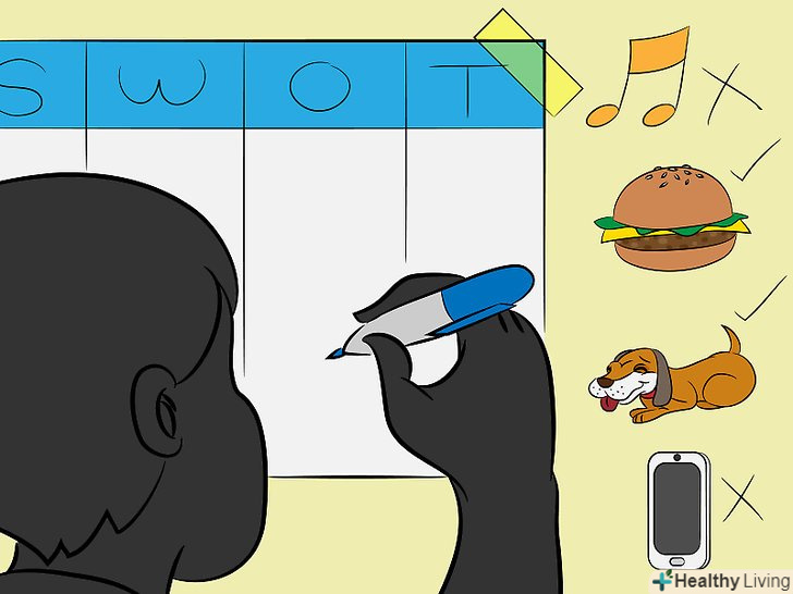 Оцініть свій підхід до навчання. [2] Подумайте, як ви вчилися весь цей час. Визначте, які прийоми працюють, а які ні, і запитайте себе чому. Складіть список речей, якими ви не хотіли б займатися в майбутньому (наприклад, прокрастинувати), і не займайтеся ними. Вирішіть, в чому для вас полягає мета освіти, і правильно використовуйте цю інформацію.- Зараз саме час навчитися робити SWOT-аналіз (Strengths – сильні сторони, Weaknesses – слабкі сторони, Opportunities – можливості, Threats – перешкоди).[3] цей метод був розроблений для бізнесу, проте він може бути адаптований і під ваші потреби.