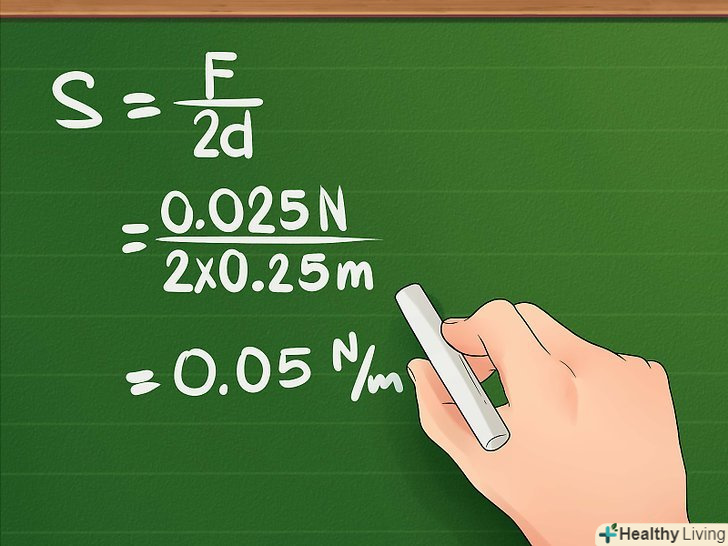 Підставте отримані значення в рівняння і знайдіть шукану величину.за допомогою отриманих в ході експерименту результатів можна визначити поверхневий натяг. Просто підставте знайдені величини і обчисліть результат.- Припустимо, що в наведеному вище прикладі довжина голки становить 0,025 метра. Підставляємо значення в рівняння і отримуємо: S = F/2D = 0,025 Н/(2 x 0,025) = 0,05 Н/М. Таким чином, поверхневий натяг рідини одно 0,05 Н / м.