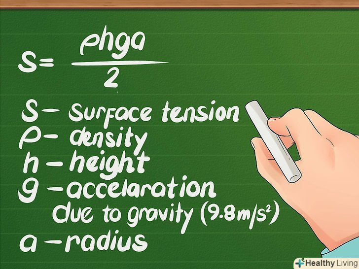 Запишіть рівняння для визначення поверхневого натягу. Поверхневий натяг обчислюється наступним чином: S = (ρhga/2), де S — поверхневий натяг, ρ — густина досліджуваної рідини, h — висота підйому рідини в трубці, g — прискорення вільного падіння завдяки діє на рідину силі тяжіння (9,8 м/с2), a — радіус капілярної трубки.[7]- При підстановці даних в це рівняння простежте, щоб вони були виражені вметричних одиницях виміру: щільність в кг/м3, висота і радіус в метрах, прискорення вільного падіння в м/с2.