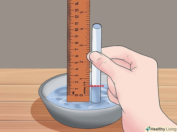 Виміряйте висоту, на яку піднялася рідина над своїм рівнем в тарілці.підведіть край лінійки до поверхні рідини в тарілці і визначте, на яку висоту піднялася рідина в трубці. Вода в трубці піднімається через те, що підйомна сила поверхневого натягу перевищує тягне вниз силу тяжіння.[9]