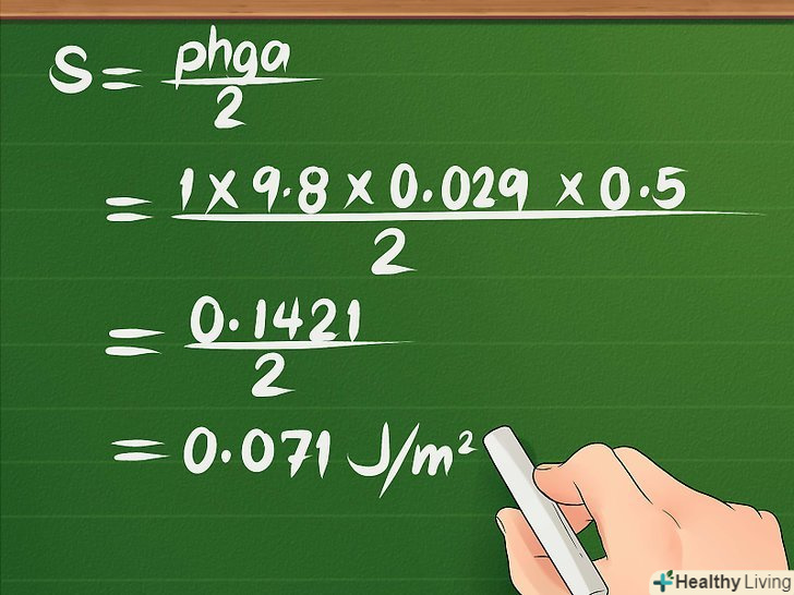 - Підставимо отримані величини в рівняння і отримаємо: S = (ρhga/2) = (1 x 9,8 x 0,029 x 0,5)/2 = 0,1421/2 = 0,071 Дж / м2.