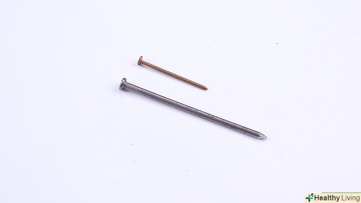 - Обмотайте цвях тонким мідним дротом, покритим лаком.Візьміть цвях або шуруп і обмотайте його мідним дротом. З обох сторін дроту залиште по вільному кінця довжиною близько 8 сантиметрів-вони знадобляться, щоб під'єднати дріт до батарейці.[3]
