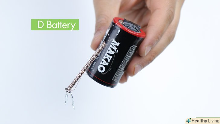Підключіть до дроту більшу батарейку.[9] хоча для даного експерименту добре підходить пальчикова батарейка (елемент АА), можна використовувати і більшу батарейку, щоб збільшити силу магніту. Спробуйте замінити пальчикову батарейку елементом D і подивіться, чи стане магніт більш потужним.- Підключіть кінці дроту до полюсів батарейки D так само, як робили це з пальчикової батарейкою.