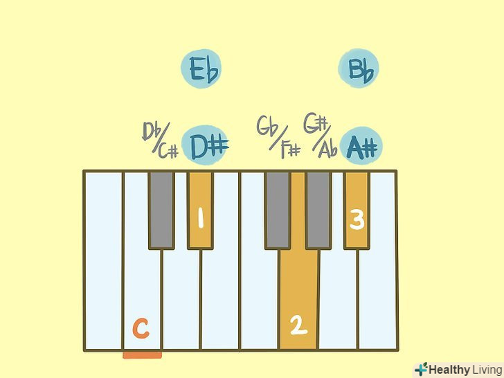 Знайдіть мажорну терцію.друга нота в мажорному акорді-мажорна Терція, яка надає акорду характер. Вона вище основного тону на чотири півтони або пів-інтервалу. Вона називається терцією, оскільки, коли ви граєте тональність в цьому ключі, вона буде третьою нотою.- Для акорду C (до) мажор, E (ми) – Терція. Вона на чотири напівінтервали вище C (до). Ви можете порахувати їх на своєму фортепіано (C#, D, D#, E – до дієз, ре, ре дієз, Мі).
