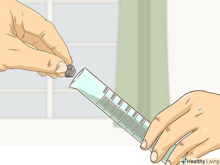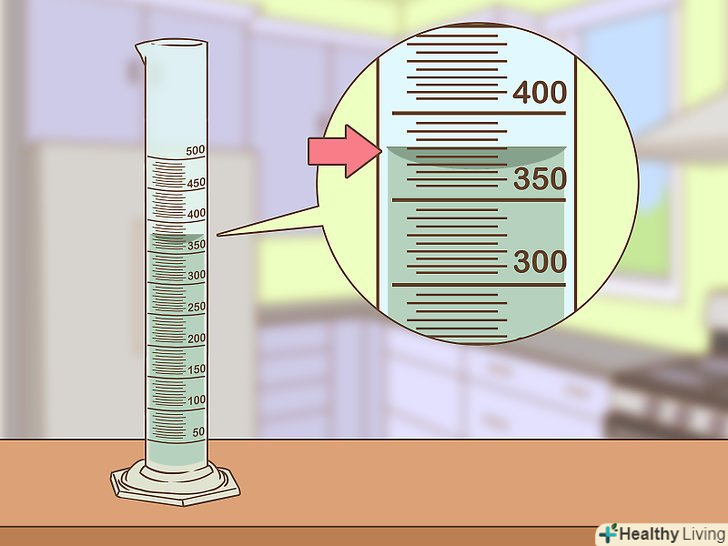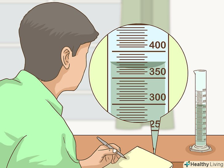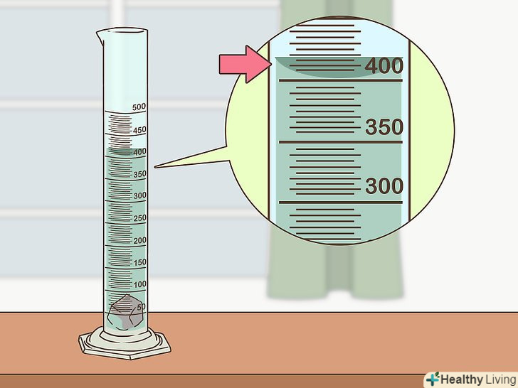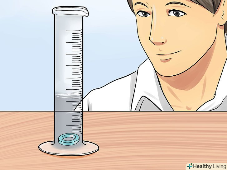 Виміряйте рівень води.зачекайте, поки предмет опуститься на дно і вода заспокоїться. Циліндр повинен стояти на горизонтальній рівній поверхні. Погляньте на рівень води і визначте значення меніска. З предметом всередині циліндра рівень повинен підвищитися. [5]