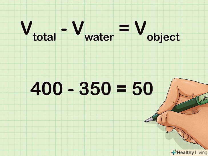 Підрахуйте різницю між значеннями рівнів. вийде формула Vзагальний – Vводи = Vпредмета . V загальний - це кінцевий рівень води, а Vводи - це початковий рівень води, тоді як Vпредмета — це обсяг тіла неправильної форми. Іншими словами, необхідно відняти значення першого виміру з другого, щоб дізнатися обсяг предмета.[8]