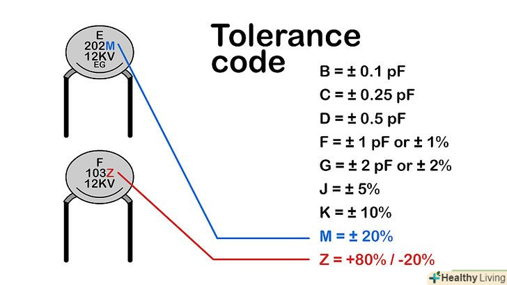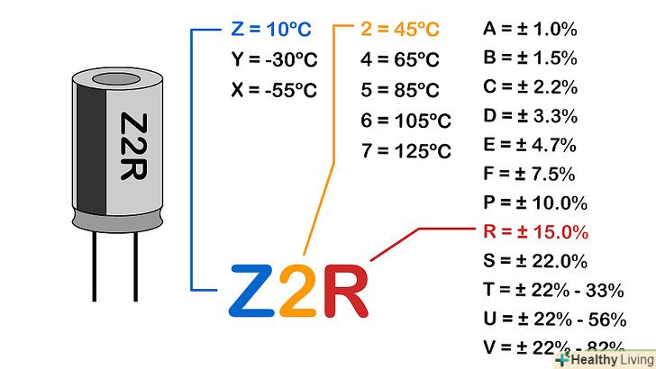 Визначте значення допуску, коли маркування має вигляд «буква-цифра-буква». таке маркування наноситься на багато типів конденсаторів і інтерпретується наступним чином: [15]- Перший символ (буква) позначає мінімальну температуру.Z = 10ºC, Y = -30ºC, X = -55ºC.