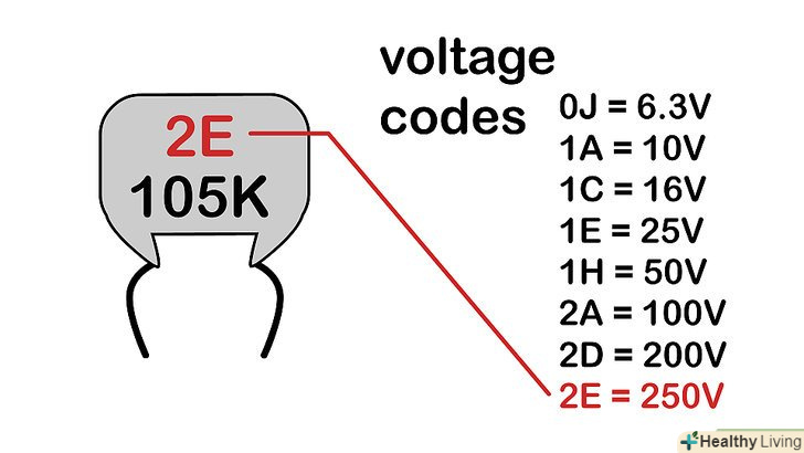 Визначте значення напруги . Повний список символів наводиться в таблиці стандарту EIA, але в більшості випадків використовуються наступні Символи, що позначають максимально допустиму напругу (значення наведені тільки для конденсаторів, призначених для ланцюгів постійного струму):[17]- 0J = 6,3 В