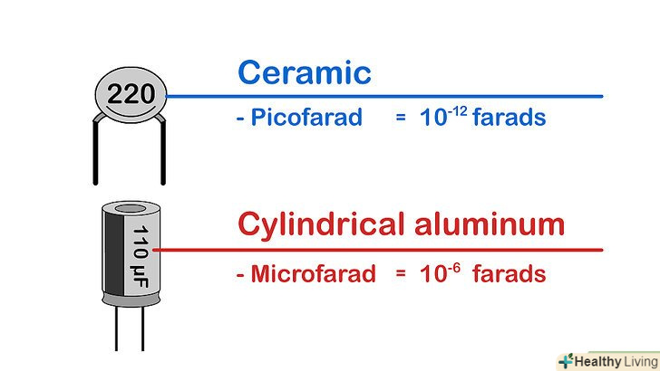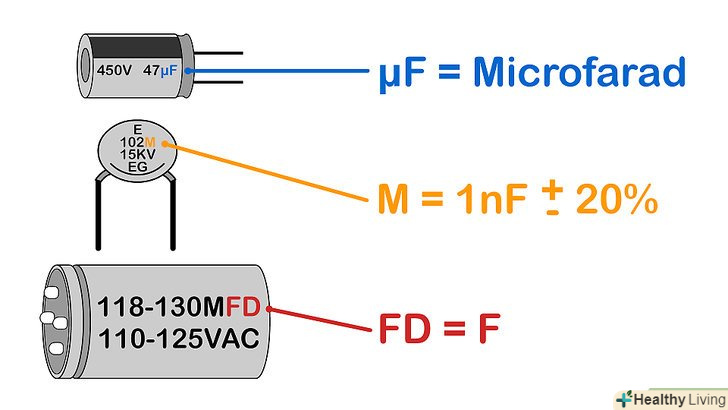 Визначте одиниці виміру . У більшості випадків ємність найменших конденсаторів (керамічних, плівкових, танталових) вимірюється в пікофарадах (пФ, pF), які рівні 10-12 Ф. ємність великих конденсаторів (алюмінієвих електролітичних або двошарових) вимірюється в мікрофарадах (мкФ, uF або µF), які рівні 10-6 ф.[9]- Можливо, на корпусі конденсатора буде проставлена буква, що позначає одиницю виміру, наприклад, p – пікофарад, n – нанофарад, u – мікрофарад. Але якщо після цифр стоїть одна буква, швидше за все, цемаркування значення допуску, а не маркування одиниці виміру (як правило, букви «p» і «n» в маркуванні значення допуску не беруть участь, але бувають винятки).