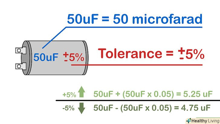Визначте значення допуску. На корпус деяких конденсаторів наноситься значення допуску, тобто допустиме відхилення номінальної ємності від зазначеної; враховуйте цю інформацію, якщо при складанні електроланцюга необхідно знати точне значення ємності конденсатора. Наприклад, якщо на конденсаторі нанесена маркування " 6000uF + 50% / -70%", то його максимальна ємність дорівнює 6000+(6000 * 0,5)=9000 мкФ, а мінімальна– 6000-(6000*0,7)=1800 мкФ.- Якщо відсотки не вказані, шукайте букву, розташовану окремо або після чисельного значення ємності. Певна буква позначає конкретне значення допуску. Для інтерпретації такого маркування перейдіть до п'ятого кроку наступного розділу.