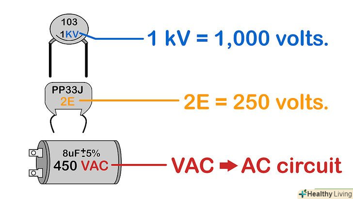 - По маркуванню можна визначити значення робочої напруги конденсатора. Конденсатор повинен бути розрахований на напругу, яка більше напруги у вашій ланцюзі; в іншому випадку ви зіткнетеся зі збоями в роботі ланцюга (можливо, конденсатор вибухне).