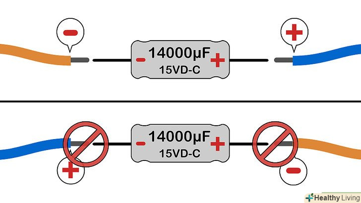 Пошукайте Символи «+» або «-».якщо на корпусі конденсатора присутній один з цих символів, такий конденсатор поляризований. В цьому випадку підключіть позитивний ( » + " ) контакт конденсатора до позитивної клеми Джерела живлення; в іншому випадку може статися коротке замикання конденсатора або конденсатор може вибухнути.[6] якщо символів » + « або » - " на корпусі немає, ви можете включати конденсатор в ланцюг так, як вам завгодно.- Для позначення полярності на деякі конденсатори наносять кольорову смугу або роблять кільцеподібне поглиблення. Таке маркування позначає негативний ( » - " ) контакт на алюмінієвих електролітичних конденсаторах (форма таких конденсаторів аналогічна формі консервної банки). На танталових електролітичних конденсаторах (дуже маленькі) таке маркування позначає позитивний ( « + » ) контакт.[7] не звертайте увагу на кольорове маркування, якщо на корпусі є Символи » + " або " » " або якщо розглянутий конденсатор не є електролітичним.
