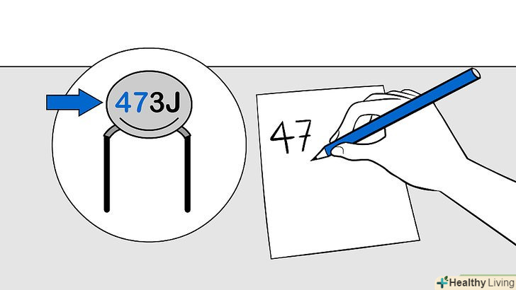 Запишіть перші дві цифри значення ємності.якщо конденсатор маленький і на його корпусі не поміщається значення ємності, воно маркується відповідно до стандарту EIA (це справедливо для сучасних конденсаторів, чого не скажеш про старі конденсатори). Для початку запишіть перші дві цифри, а потім зробіть наступне:[8]- Якщо маркування складається тільки з двох цифр і однієї літери, наприклад, 44М, то перші дві цифри – це значення ємності конденсатора.перейдіть до третього кроку цього розділу , щоб дізнатися, як визначити одиниці виміру.