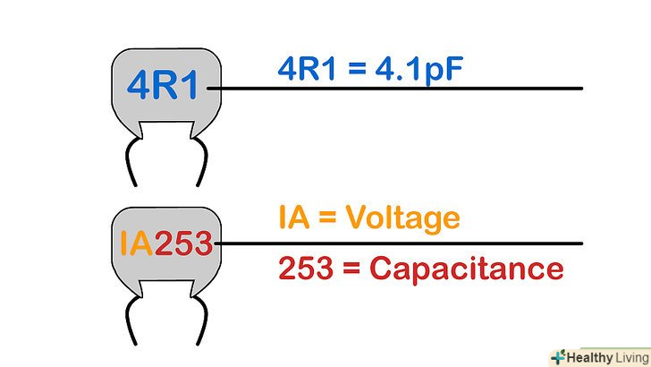 Інтерпретуйте маркування, що включає літери . Якщо одним з перших двох символів маркування є буква, інтерпретуйте це наступним чином:- Замініть букву " R " на десяткову кому і отримаєте значення ємності, вимірюване в пікофарадах. Наприклад, маркування " 4R1 " - це ємність, рівна 4,1 ПФ.[10]