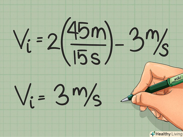 Вирішіть рівняння. підставивши в формулу відомі значення, скористайтеся необхідними перетвореннями для отримання відповіді. Якщо можна, використовуйте калькулятор, щоб зменшити ймовірність прорахунків при обчисленнях.- Припустимо, об'єкт подолав відстань 15 метрів (49,2 фута) протягом 45 секунд, і його кінцева швидкість становить 17 метрів (55,8 фута) в секунду. Знайдемо початкову швидкість об'єкта.