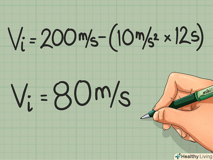 Використовуйте відповідне рівняння. при вирішенні фізичного завдання необхідно знати, яка формула вам знадобиться. Для цього насамперед слід записати всі дані, наведені в умові завдання. Якщо відомі кінцева швидкість, прискорення і час, для визначення початкової швидкості зручно використовувати наступне співвідношення:- V i = V f - (a * t)
