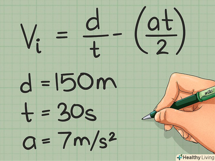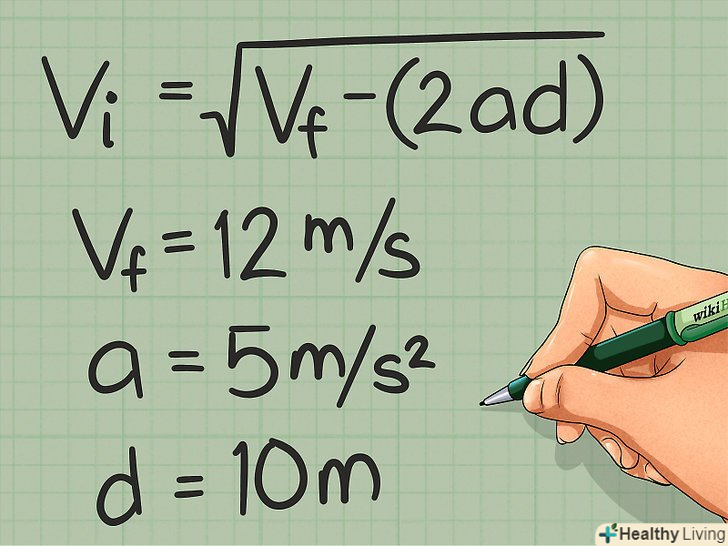 Використовуйте відповідне рівняння. для вирішення фізичного завдання необхідно вибрати відповідну формулу. Насамперед слід записати всі початкові дані, зазначені в умові завдання. Якщо відомі кінцева швидкість, прискорення і пройдену відстань, для визначення початкової швидкості зручно використовувати наступне співвідношення:- V i = √ [V f 2 - (2 * a * d)]