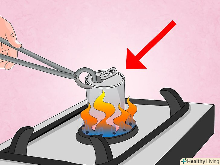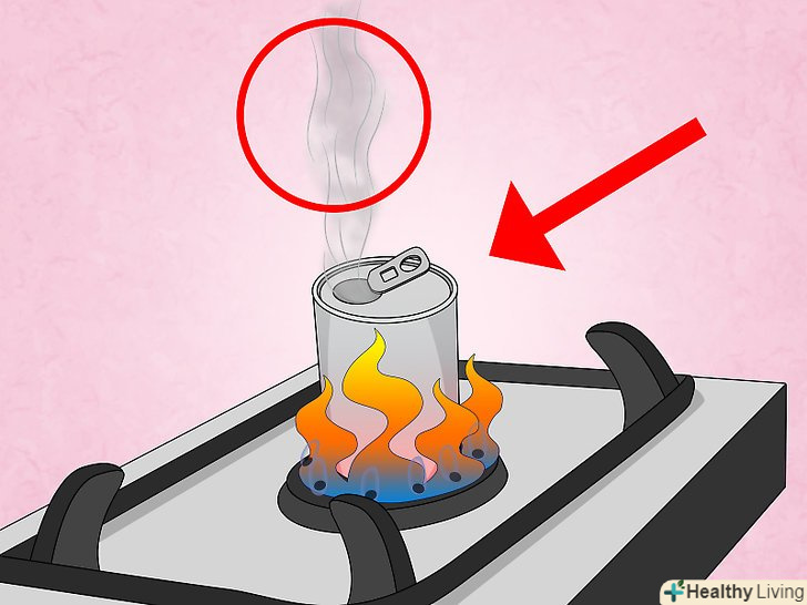 Розігрійте банку на плиті. поставте алюмінієву банку дном на пальник, потім зробіть маленький вогонь або ступінь нагріву. Дайте воді закипіти, щоб вона вирувала і випускала пар близько 30 секунд [2] .- Якщо відчуєте дивний або металевий запах, відразу ж приступайте до наступного кроку. Вода могла википіти або жар міг бути занадто великим, так що фарба або алюміній почали плавитися [3] .