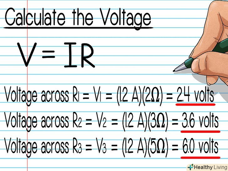 Розрахуємо напругу на кожному резисторі.Нам відомі їх опору, що протікає через них струм, і в нашому розпорядженні є рівність, що зв'язує струм і опір з напругою. Підставляючи в це рівність чисельні значення, знаходимо відповідь. Для нашого прикладу це виглядає наступним чином:- Напруга на резисторі R1 = V1 = (1,2 a)(2ома) = 2,4 вольта.
