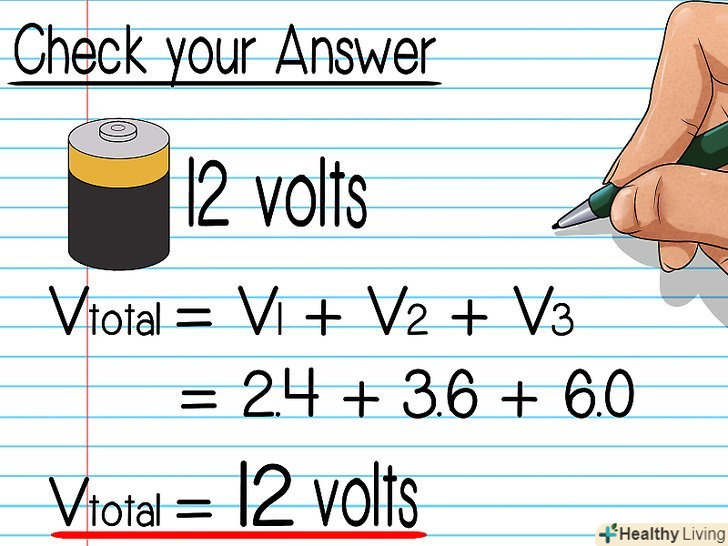 Перевіримо отриману відповідь.при послідовному з'єднанні сума напруг на кожному опорі повинна дорівнювати загальній напрузі в ланцюзі.[3] складіть знайдені напруги, перевіривши, чи дорівнює їх сума повній напрузі. Якщо ні, перевірте рішення та знайдіть помилку.- У нашому прикладі 2,4 + 3,6 + 6,0 = 12 вольт, що відповідає загальній напрузі в ланцюзі.