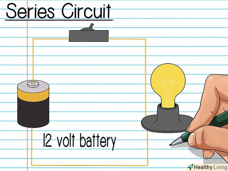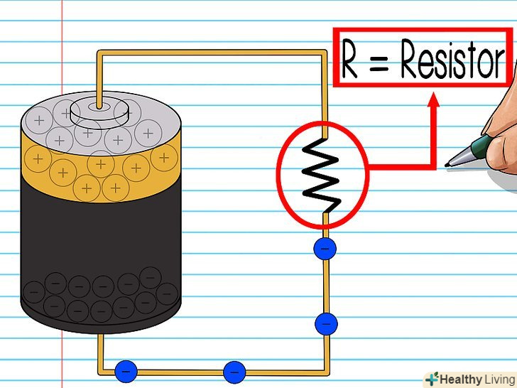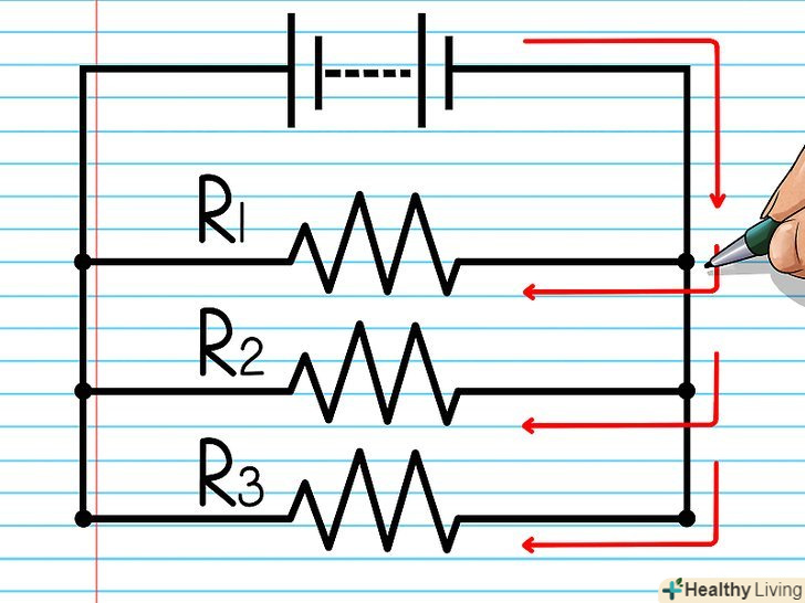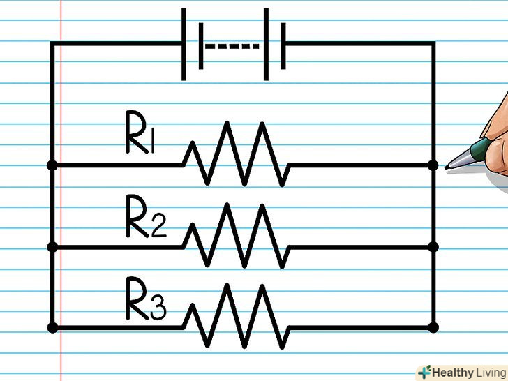 Ознайомтеся з поняттям паралельного з'єднання.Уявіть собі, що ви під'єднали провід до одного полюса батарейки і розщепили його уздовж на дві половини. Ці дві частини дроту йдуть паралельно один одному і потім знову з'єднуються в один провід перед другим полюсом батарейки. Якщо розмістити на обох гілках дроти по резистору, вони будуть з'єднані»паралельно".[4]- Паралельно можна з'єднати будь-яку кількість опорів. Даний опис годиться і для ланцюга, що складається з сотні паралельних проводів.