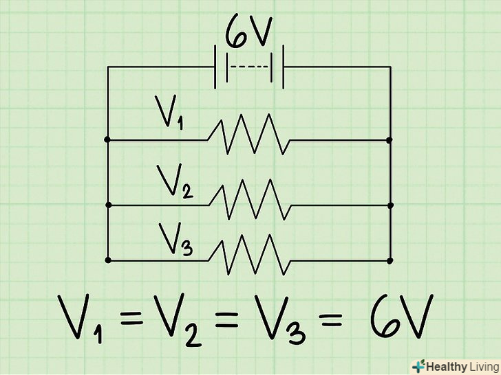 Знаючи загальну напругу, знайдемо напругу на кожному резисторі.зробити це дуже просто, якщо відомо загальна напруга в ланцюзі. При паралельному з'єднанні напруга на кожній гілці дорівнюватиме загальній напрузі в ланцюзі.[5] припустимо, що наша ланцюг складається з двох паралельно з'єднаних опорів і харчується 6-вольтової батарейкою. В цьому випадку напруга і на лівому, і на правому опорі складе 6 вольт. При цьому кожна гілка може містити будь-яке число резисторів. Щоб зрозуміти це, повернемося до послідовного з'єднання, розглянутого вище:- Як ми пам'ятаємо, при послідовному з'єднанні загальна напруга являє собою суму напруг на кожному опорі.