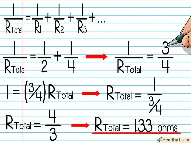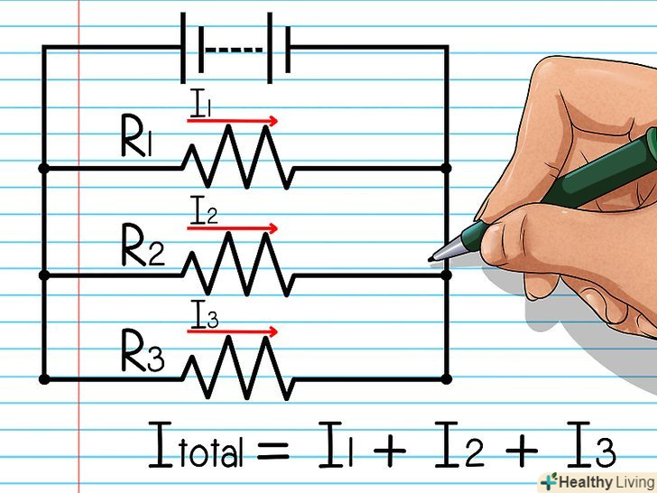 Знайдемо загальний струм в ланцюзі.якщо в умові задачі не вказано загальну напругу, знадобляться деякі додаткові обчислення. Почнемо з знаходження загального струму, що протікає по ланцюгу. При паралельному з'єднанні загальний струм дорівнює сумі струмів, що проходять через кожну гілку ланцюга.[6]- У математичному записі це означає: iзагальний = I1 + i2 + i3...