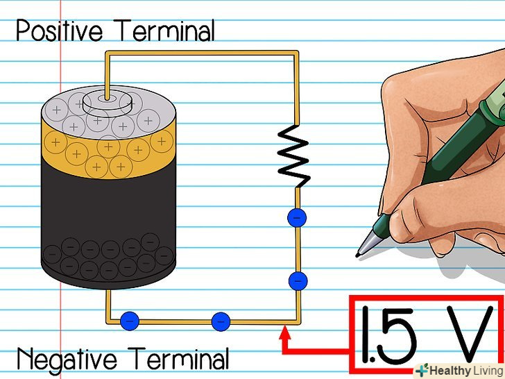 - Якщо ви з'єднаєте дротом негативний і позитивний полюса, у скупчилися електронів з'явиться можливість покинути негативний полюс. Вони почнуть перетікати до позитивного полюса, створюючи електричний струм. Чим вище напруга, тим більше електронів переміститься до позитивного полюса за одиницю часу.